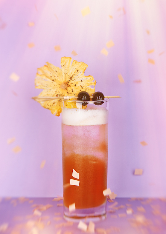 將所有原料搖勻,倒入加冰的高球杯。加滿蘇打水。用蘸有粉紅胡椒粒和細鹽的一片菠蘿裝飾。
