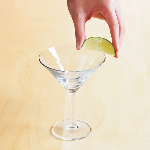 做法:1.將酒杯邊緣貼近青檬片,轉一周以濕邊。