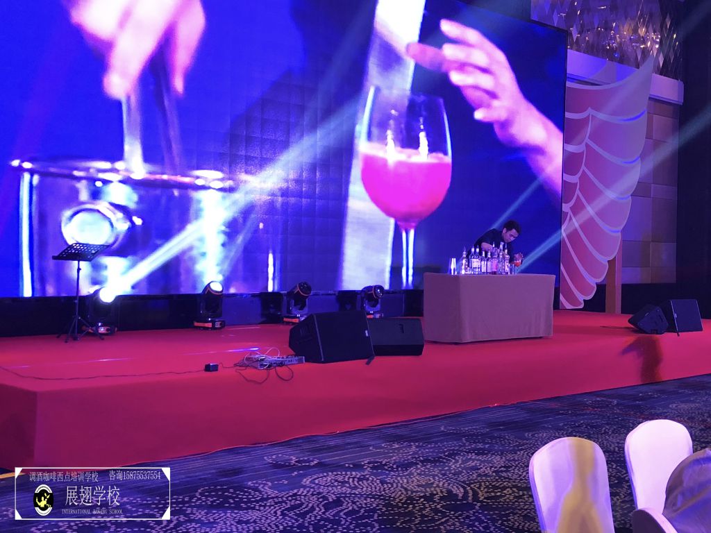 不多時,全場佳肴已近杯盤狼藉,賓客們帶著點疲倦,會議氣氛一時走入低谷。瞬間,滾動性極強的音樂使得全場目光都投注到大屏幕上,佛山展翅咖啡調酒西點培訓學校的花式調酒師張韋杰先生已經登場。張韋杰先生前面的桌上擺放著七八瓶不同款式的酒,少許調酒工具,和一只雞尾酒酒杯。全場帶著好奇的目光盯著臺上:能調出什么顏色的酒?