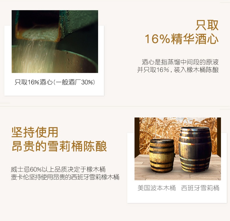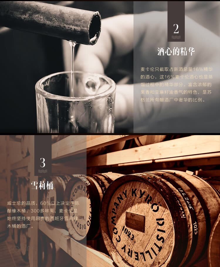 麥卡倫經典雪莉桶系列,經過了經驗老道的手工制桶和雪莉酒潤陳,汲取了西班牙雪莉橡木桶充分的風味和復雜度,賦予其天然飽滿的色澤,豐厚優雅的香氣,與干果、香辛料的特有口感,也充分傳遞了麥卡倫酒廠和調酒師對麥卡倫酒液質量和風味的堅持。使得麥卡倫經典雪莉桶系列成為蘇格蘭單一麥芽威士忌中的典范。