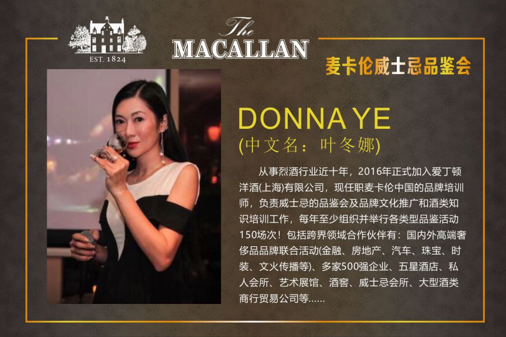 麥卡倫中國品牌培訓師 DONNA YE 葉冬娜 2016年加入愛丁頓洋酒集團。目前現任職麥卡倫中國的品牌培訓師,負責威士忌的品鑒會及品牌文化推廣和酒類知識培訓工作。