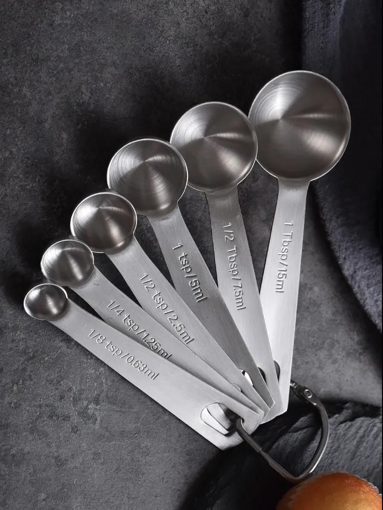 按容積稱量的液體用量杯,極少用量的粉類和液體可以用量匙稱量。量匙常用的一般有四個規格:一大匙或叫一湯匙(15ml)、一小匙或叫一茶匙(5ml)、1/2小匙(2.5ml)、1/4小匙(1.25ml),量取時如果是粉類,按一滿匙并刮去多余的冒尖部分為準。