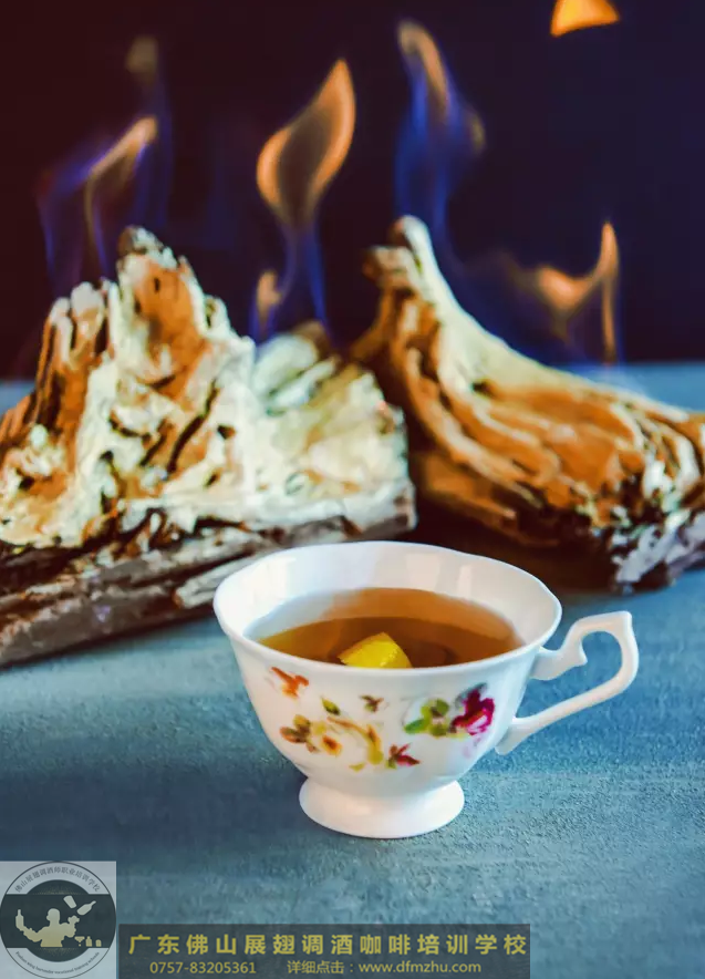 取兩只金屬耳杯,將所有原料倒入其中一只并點(diǎn)燃。用兩只耳杯小心拉制12-15次燃燒的酒液。完全熄滅火焰,濾入古董茶杯,以檸檬皮卷裝飾。